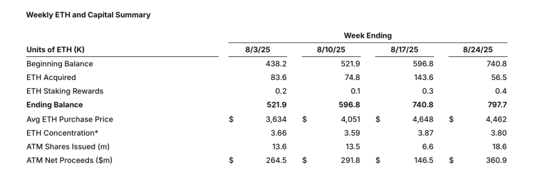 The company announced it has acquired 56,533 ETH at an average price of $4,462, lifting its total holdings to 797,704 ETH, valued at approximately $3.7 billion.