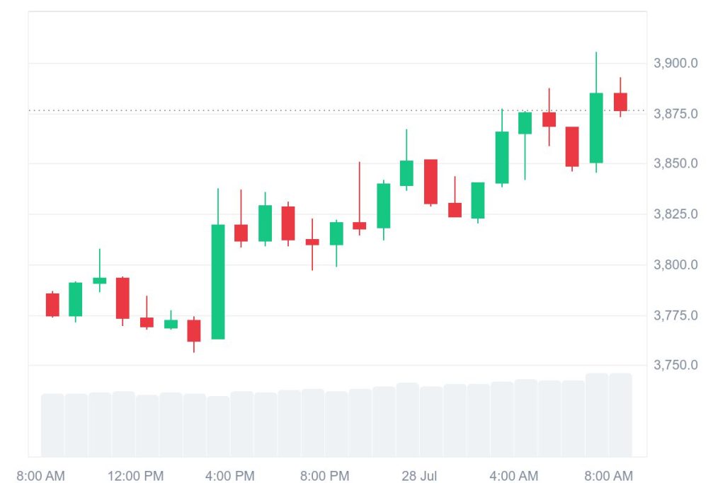 As a result, Ethereum continues to show resilience amid broader market volatility. The second-largest crypto is up 3% on Monday, trading at $3,876 during press time. According to CoinMarketCap, the surge reflects bullish technicals, institutional accumulation, and staking dynamics.