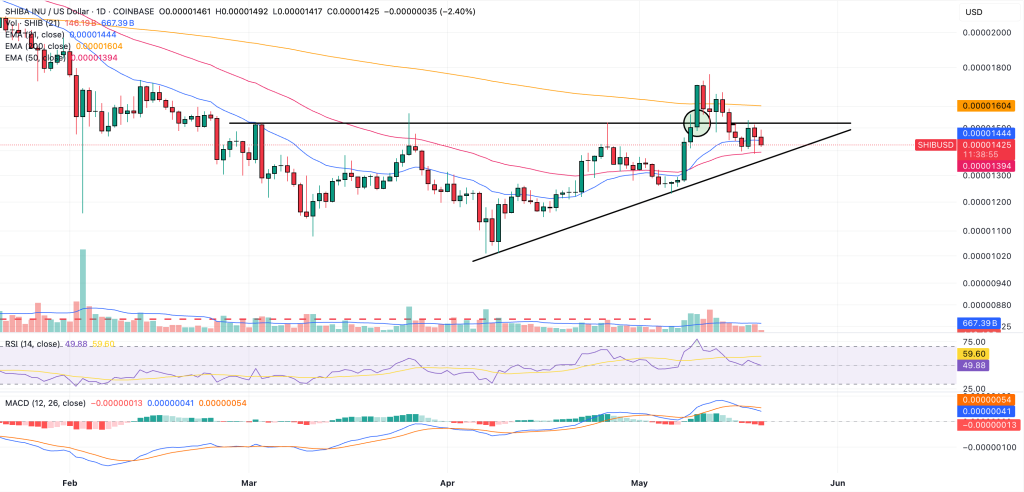 The daily chart shows that the price broke above a key resistance at $0.00001530 in the past few days but quickly retreated back into the ascending triangle as the selling pressure was strong after it crossed the 200-day exponential moving average (EMA).