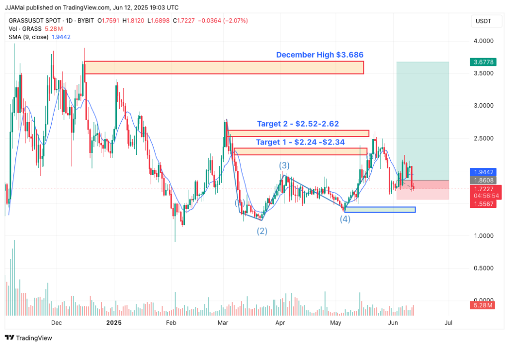Grass ($GRASS), the native token of the leading Solana-based DePIN (Decentralized Physical Infrastructure Network) platform, has declined by 15%, dropping from a high of $1.96 to settle around $1.72 at the time of writing.
