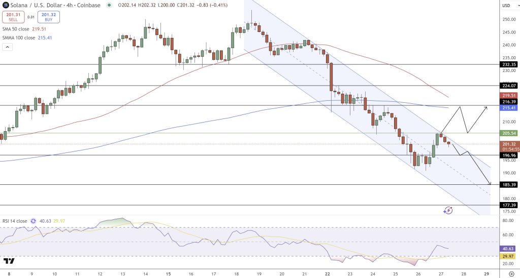 Technically, Solana price prediction remains bearish under pressure despite its recovery attempt. On the 4-hour chart, SOL is moving within a descending channel, with resistance around $205.50. The 50-period SMA at $219.50 and the 100-period SMA near $215.40 present strong hurdles that bulls must overcome.