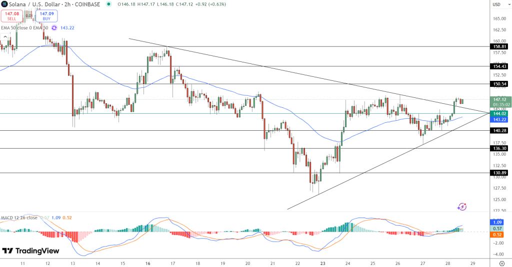 Solana (SOL) has posted a solid 4.3% gain this week, reclaiming bullish sentiment after falling to $126 just days ago. At the time of writing, SOL trades at $147.12, buoyed by a breakout above triangle resistance and improving technicals.