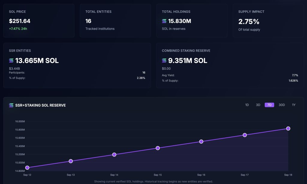 The tracker shows that 16 institutions now hold a combined 15.83 million SOL, representing 2.75% of the token’s circulating supply.