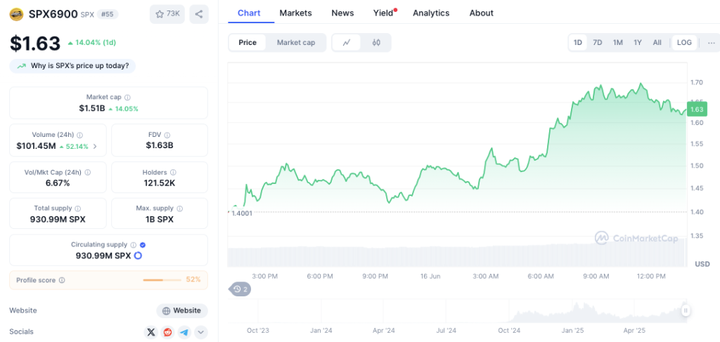 SPX6900 ($SPX) rockets 15% to $1.70, smashing a 5-month high as memecoin mania ignites again. The viral token, now a top-five memecoin, has surpassed rivals FARTCOIN and BONK with a $1.5 billion market cap explosion.