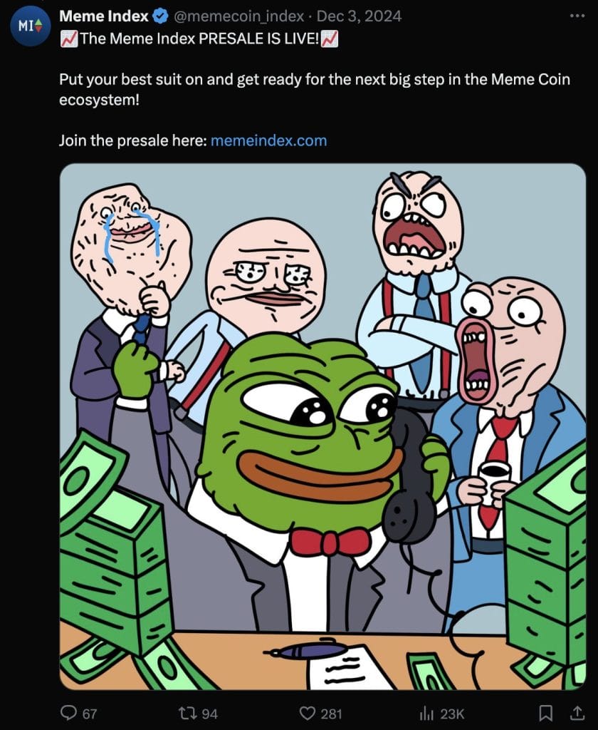 The Meme Index is an Ethereum-based platform offering a curated selection of meme coins, balancing strong growth potential with risk management.