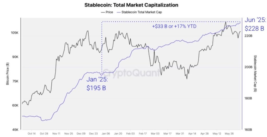 The stablecoin market is booming again in 2025, with total market capitalization reaching a new all-time high of $228 billion, according to a report by CryptoQuant.