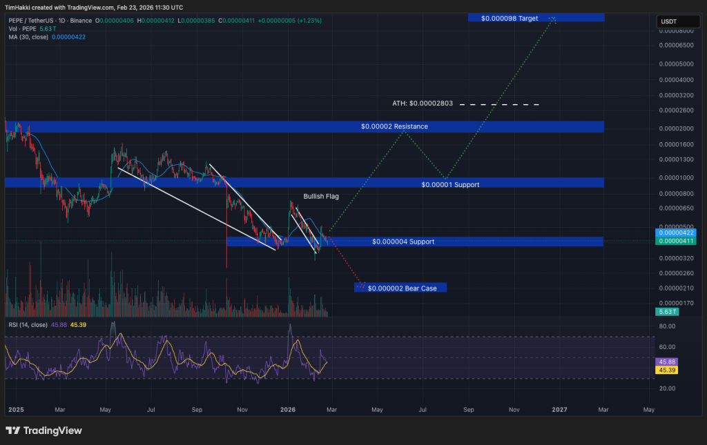 At the time of writing, PEPE trades around $0.0000041, roughly 85% below its December 2024 ATH of $0.00002803.