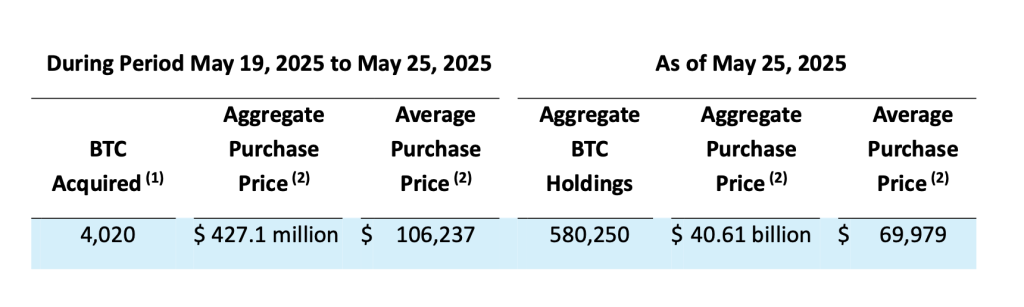Strategy Inc. (NASDAQ: MSTR) has deepened its already commanding position in the Bitcoin market, with a fresh purchase of 4,020 BTC for $427.1 million during the week of May 19–25.