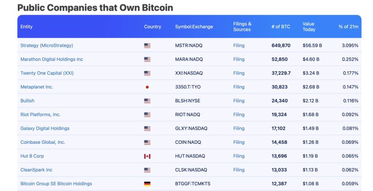 Strategy remains the world’s largest corporate holder by a massive margin, with 649,870 BTC, valued at more than $56 billion. This position alone represents over 3% of Bitcoin’s 21 million maximum supply, underscoring the company’s dominance in institutional Bitcoin accumulation.