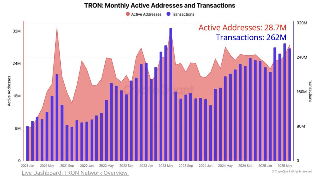 May 2025 saw TRON process 273 million transactions, its second-highest monthly figure ever. June brought further traction with 28.7 million active addresses—the most since mid-2023.