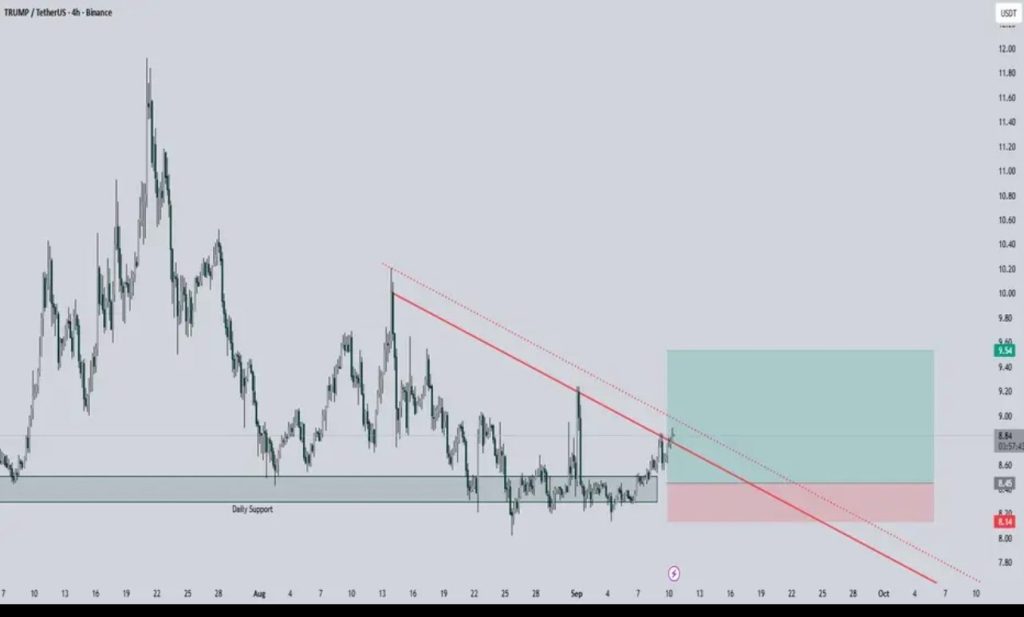 TRUMP remains in a make-or-break zone, with momentum hinging on whether the $9.00 resistance finally gives way.