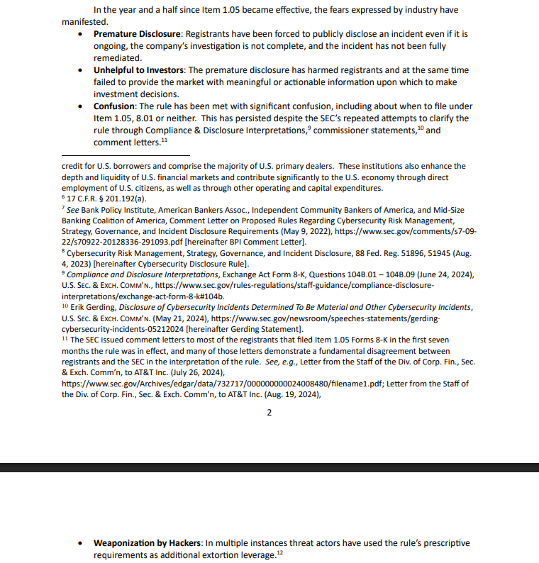 The banking groups argue that existing disclosure obligations such as Regulation S-K Item 105 and the pre-existing materiality framework already compel companies to report significant risks, including cybersecurity threats, in a way that preserves investor interests without compromising national security or company resilience.