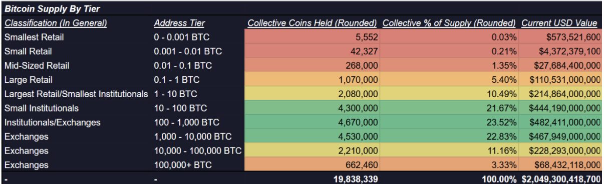 - Wallets with 10+ BTC control 82.5% of supply, leaving retail investors with just 17.5%.
