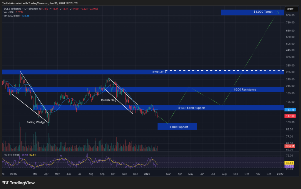 After a steep pullback late in 2025, SOL has spent recent months consolidating near a critical support zone and currently trades around $118. A substantial recovery may hinge on Bitcoin reclaiming the $100,000 level, a milestone many expect sooner rather than later.