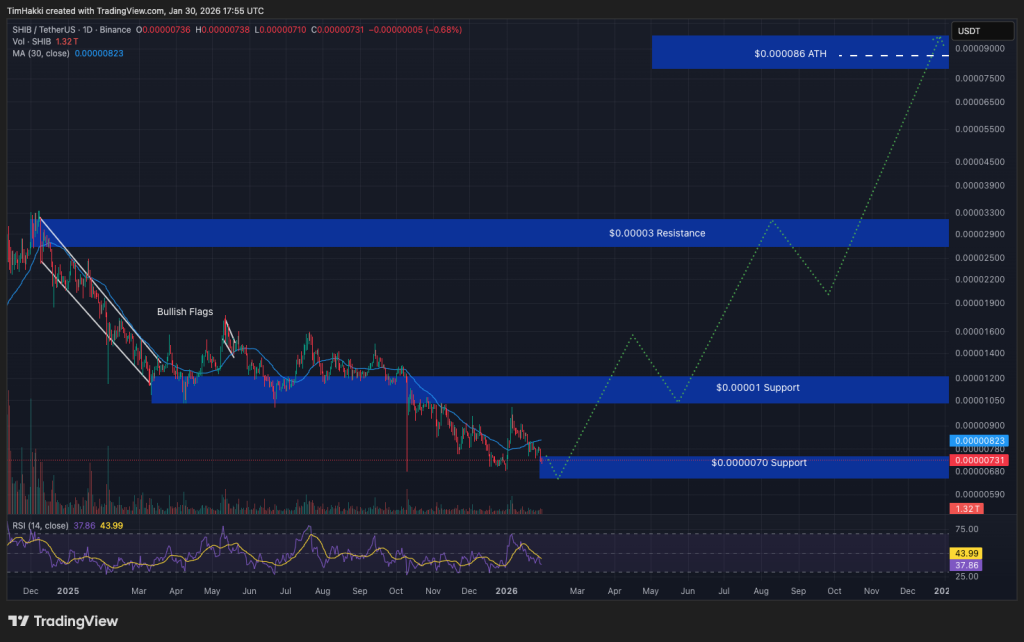 Shiba Inu’s last ATH of $0.00008616 was set in October 2021 at the height of the bull run. Recapturing this mark would give current SHIB holders 1,078.5% returns from today’s price.