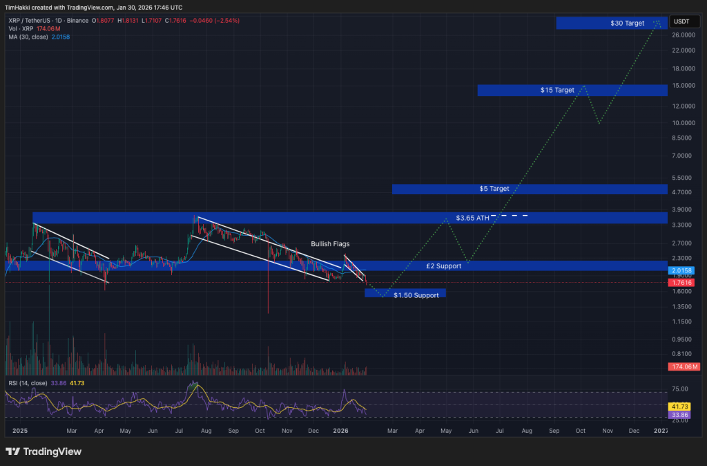 From a technical angle, XRP’s Relative Strength Index (RSI) is hovering near 43, indicating lingering selling pressure amid the current correction. However, since the New Year, the support and resistance lines have formed a bullish flag formation. Favorable macroeconomic trends and clearer regulatory guidance could trigger a breakout aligned with KIMI AI’s $15 to $30 projection.