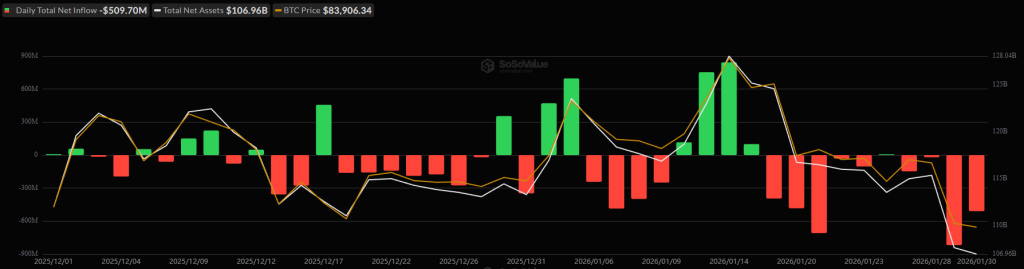 The US BTC spot exchange-traded funds (ETFs) closed last week and month with another high outflow level. They recorded $509.7 million in negative flows on Friday, 30 January. With that, the total net inflow dropped to $55.01 billion.