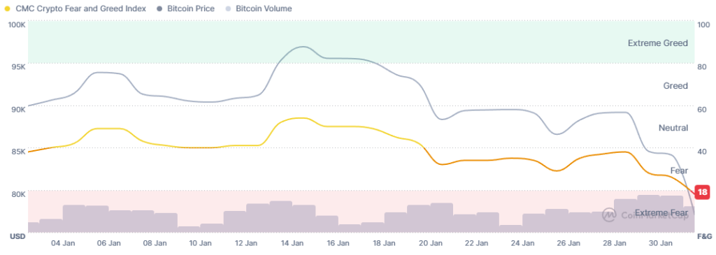 The crypto fear and greed index today stands at 18, compared to 28 on Friday and 26 on Saturday. With this move, it has entered the extreme fear zone.
