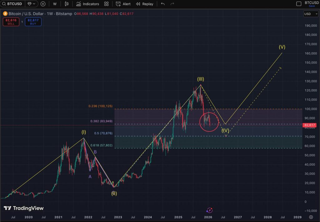 “We remain in Wave IV and look for this to complete somewhere between $71,000 and $84,000.” He adds: “Looking to accumulate BTC between these prices after having closed long positions at $117,000 once the Wave III top formed at $124,000.”