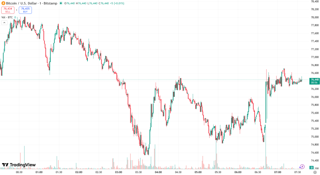At the time of writing on Monday morning, BTC was changing hands at $76,472. It has been a relatively calm day for the coin by the time of writing. It slowly decreased from the intraday high of $79,049 to the day’s low of $74,591.