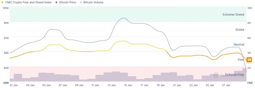 The crypto fear and greed index currently stands at 28, compared to 38 recorded yesterday. This drop moved the metric deep within the fear territory, towards extreme fear.