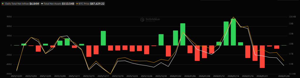 The US BTC spot exchange-traded funds (ETFs) started the week in green, breaking a five-day outflow streak. They added $6.84 million, with the total net inflow now standing at $56.5 billion.