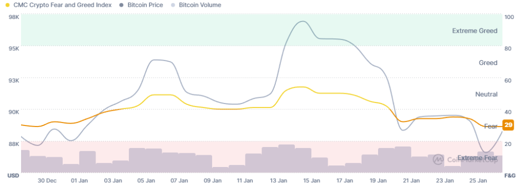 The crypto fear and greed index stands at 29 at the time of writing, the same level as yesterday.