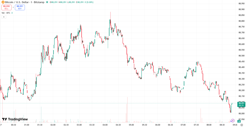 At the time of writing on Tuesday morning, BTC was changing hands at $87,702. It’s been a choppy trading day, especially in the first half, with the price falling to the low of $87,180 twice. It very briefly hit the intraday high of $88,763.