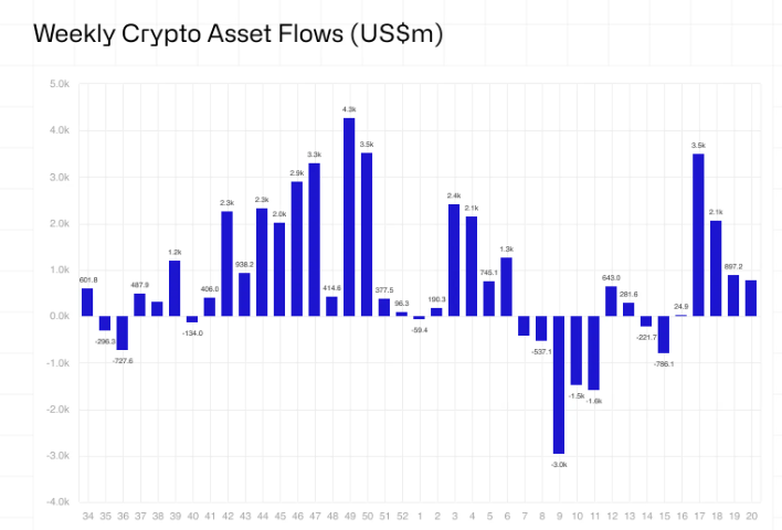 Additionally, there have been consistent spot ETF inflows supporting the price rise. According to a May 19 report by digital asset manager CoinShares, digital asset investment products recorded a fifth consecutive week of inflows last week, with $785 million. With this, the year-to-date inflows increased to $7.5 billion.