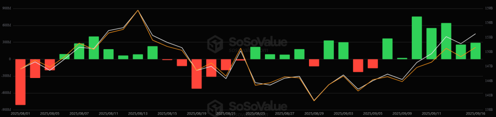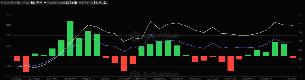 The US ETH ETFs, however, broke the inflow streak, recording $61.74 million in outflows on 16 September. Two of the nine funds saw inflows, and one saw outflows. The total net inflow is now at $13.66 billion.