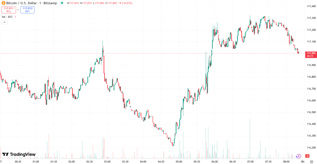 At the time of writing on Wednesday morning, BTC trades at $117,255. There was a surge earlier in the day from the intraday low of $114,866 to the intraday high of $117,292.
