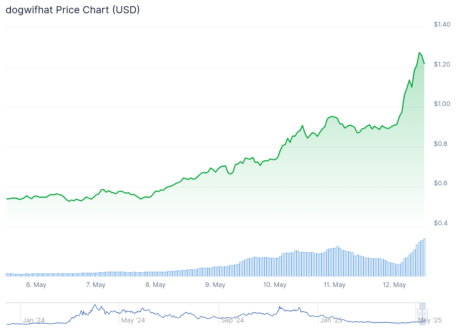 Over the past 24 hours, $WIF has jumped more than 45%. It is now trading around $1.30, with trading volume soaring to $1.27 billion.