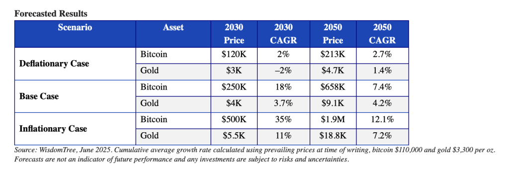 WisdomTree’s scenario-based forecast projects that in moderate inflation, steady liquidity expansion, and modest real growth—bitcoin could reach $250,000 and gold $4,000 per ounce by 2030.