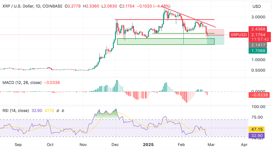 From a technical perspective, today’s sharp decline has pushed XRP below a key support level at $2.50. This breakdown signals bearish momentum, exposing the token to a potential 20.2% downside risk.
