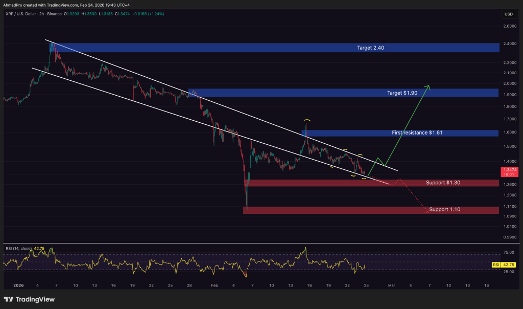 XRP is still moving inside the descending channel and just tested the lower boundary near $1.30 again.