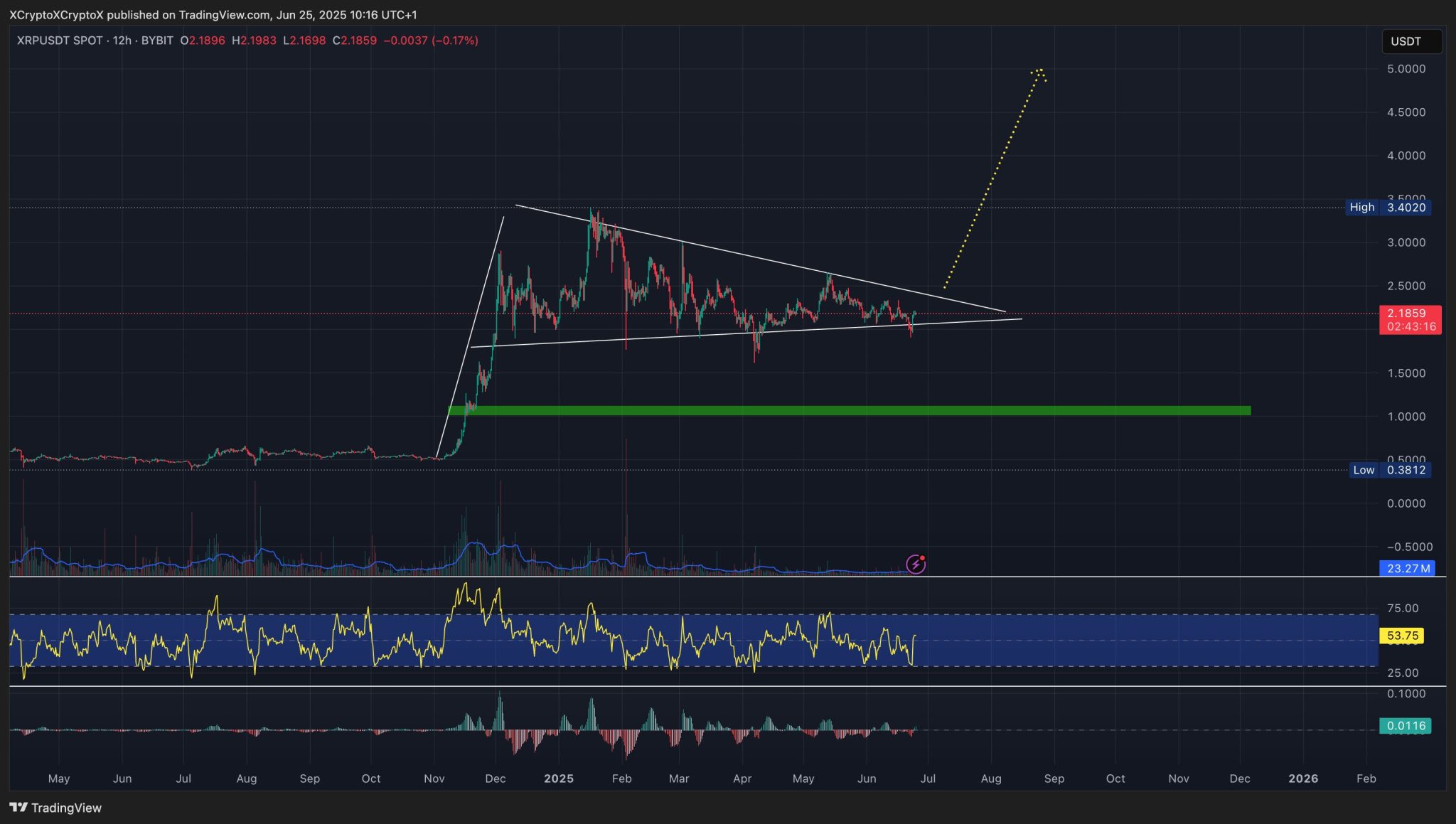 Looking at the 12-hour chart for XRP we can see that the token has formed a bullish pennant pattern as a result of the long-standing consolidation phase that came after its November 2024 rally.