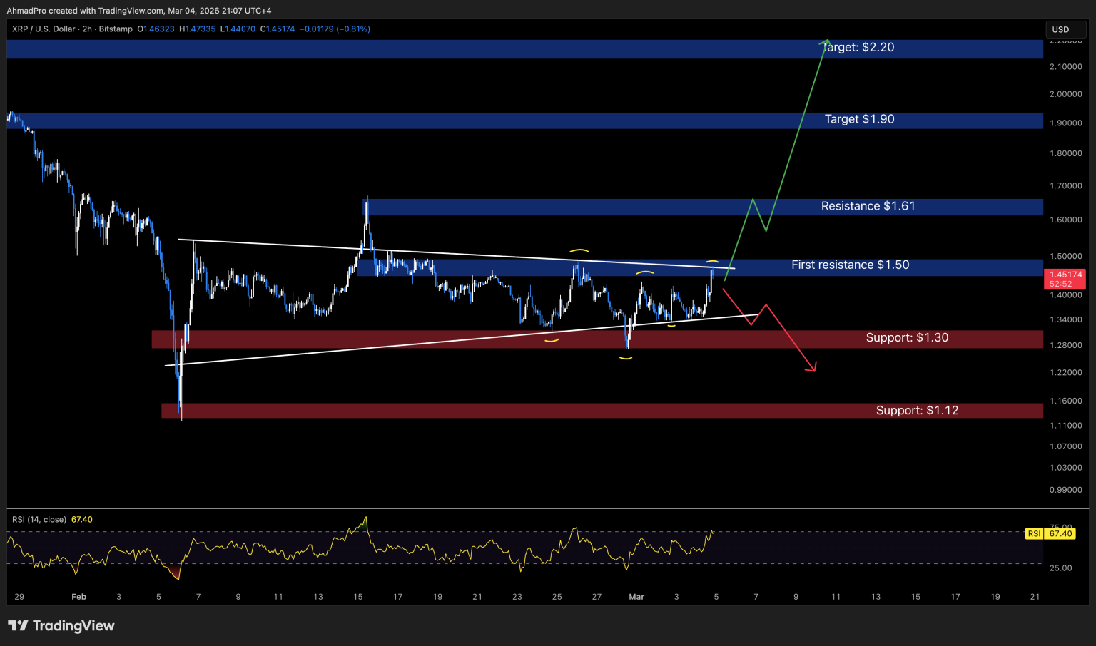 If XRP breaks and holds above $1.50, it would mark the first real shift in short-term structure. That move could open the path toward $1.61 next, with further upside targets near $1.90 and potentially $2.20 if momentum expands.