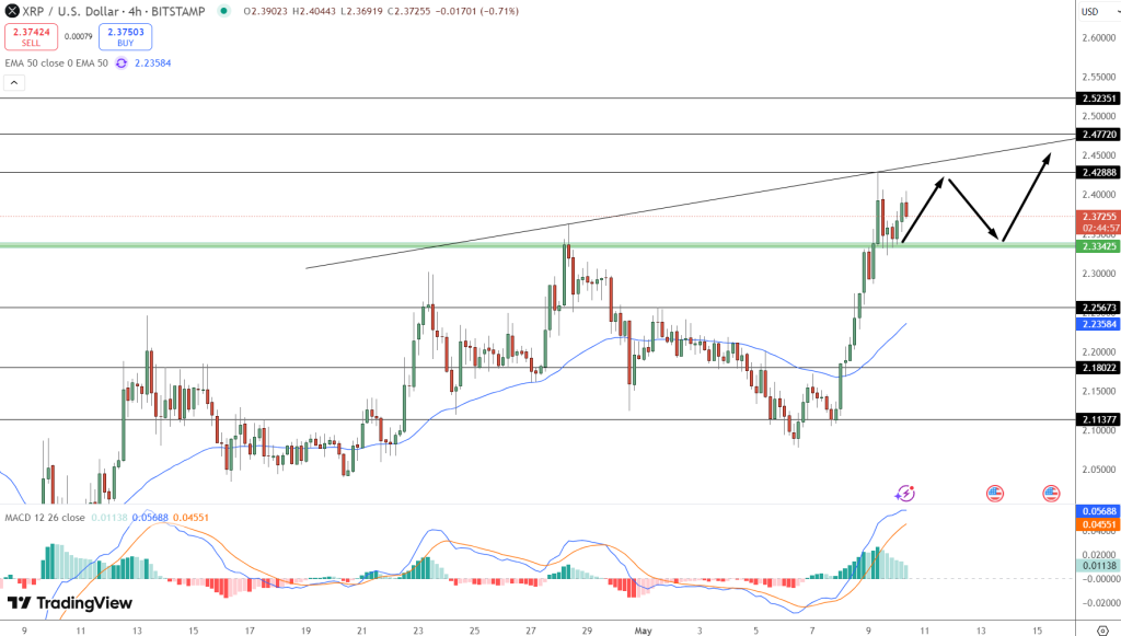 XRP price prediction is bullish as XRP is currently trading at $2.3725, approaching a key resistance at $2.4288, where a horizontal barrier and a rising trendline converge, potentially forming a significant supply zone.