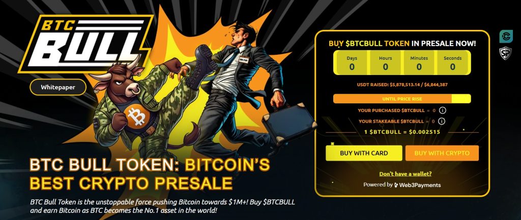 As Bitcoin stabilizes above $102K, investor focus is shifting toward yield-generating altcoins—none more so than BTC Bull Token ($BTCBULL). The token has now raised $5.87 million out of its $6.84 million presale goal, with a price increase looming as it enters its final funding stretch.