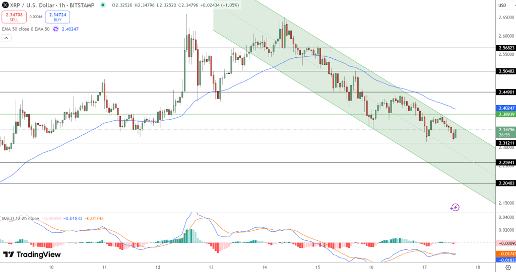 On the technical front, XRP price prediction remains slightly bearish. On the charts, XRP/USD is stuck in a descending channel on the 1-hour chart, with price consolidating at $2.35. The channel has clear lower highs and lower lows, meaning bearish control.